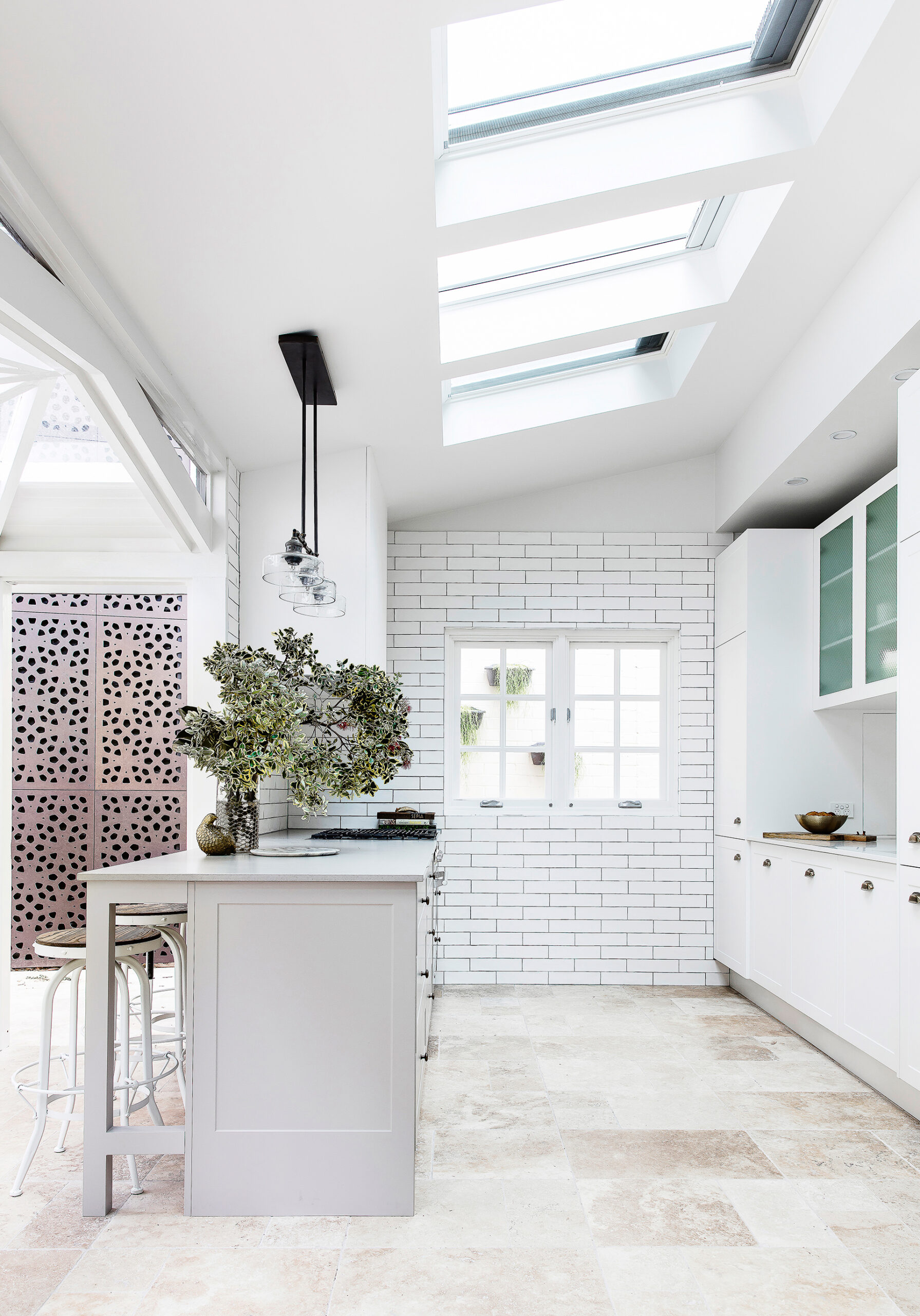 This pared-back kitchen features a concealed pantry and study nook which are both illuminated by a skylight.