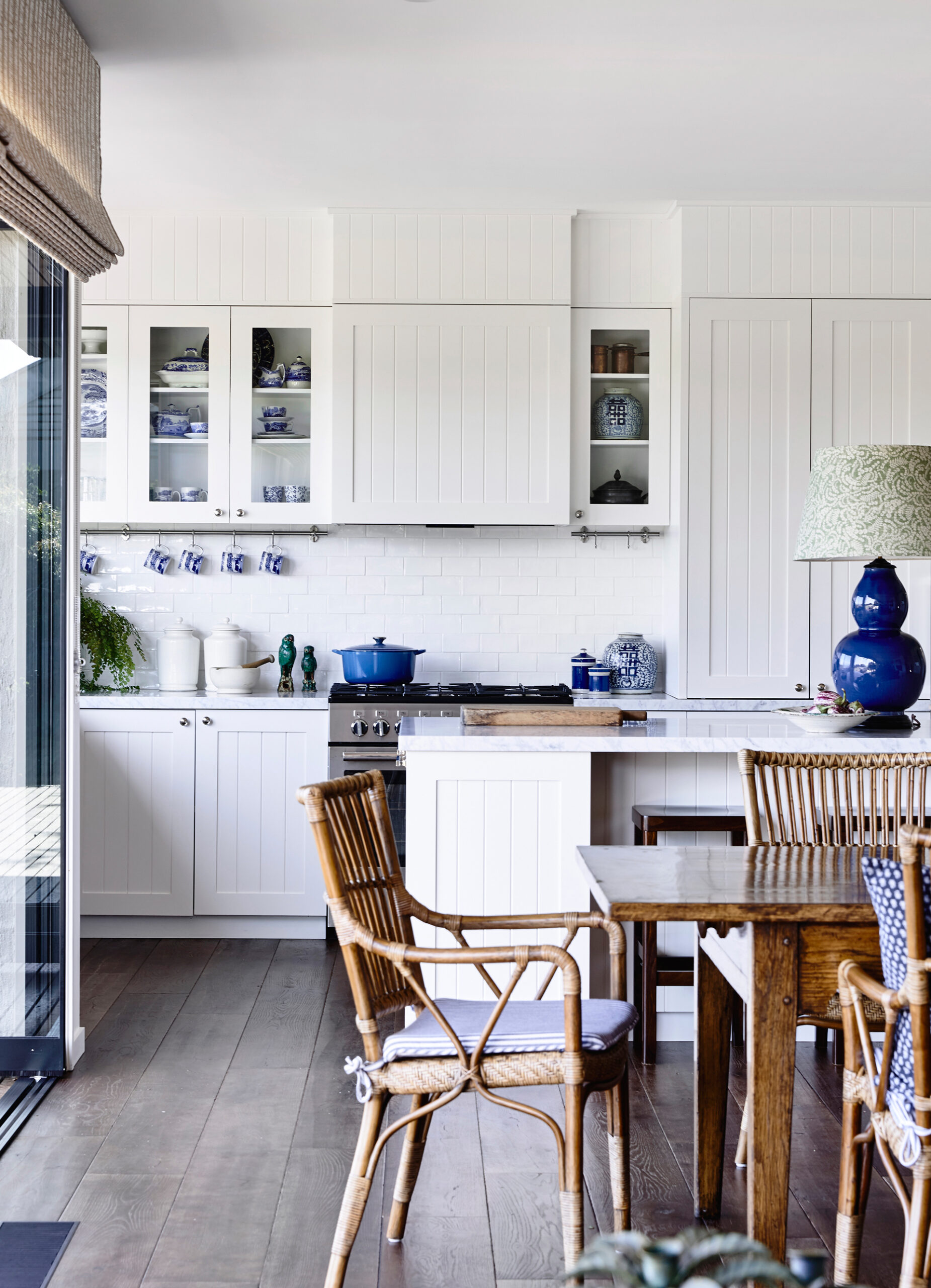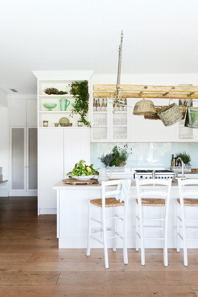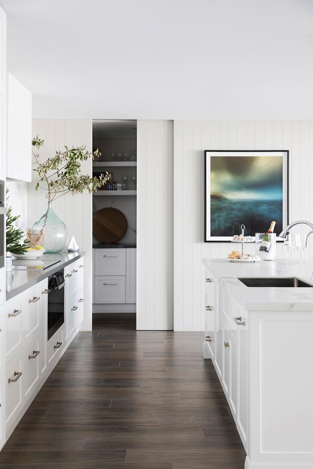 Lining boards on the walls in this kitchen add to the Hamptons vibe, while the sliding-door pantry offers discreet functionality.