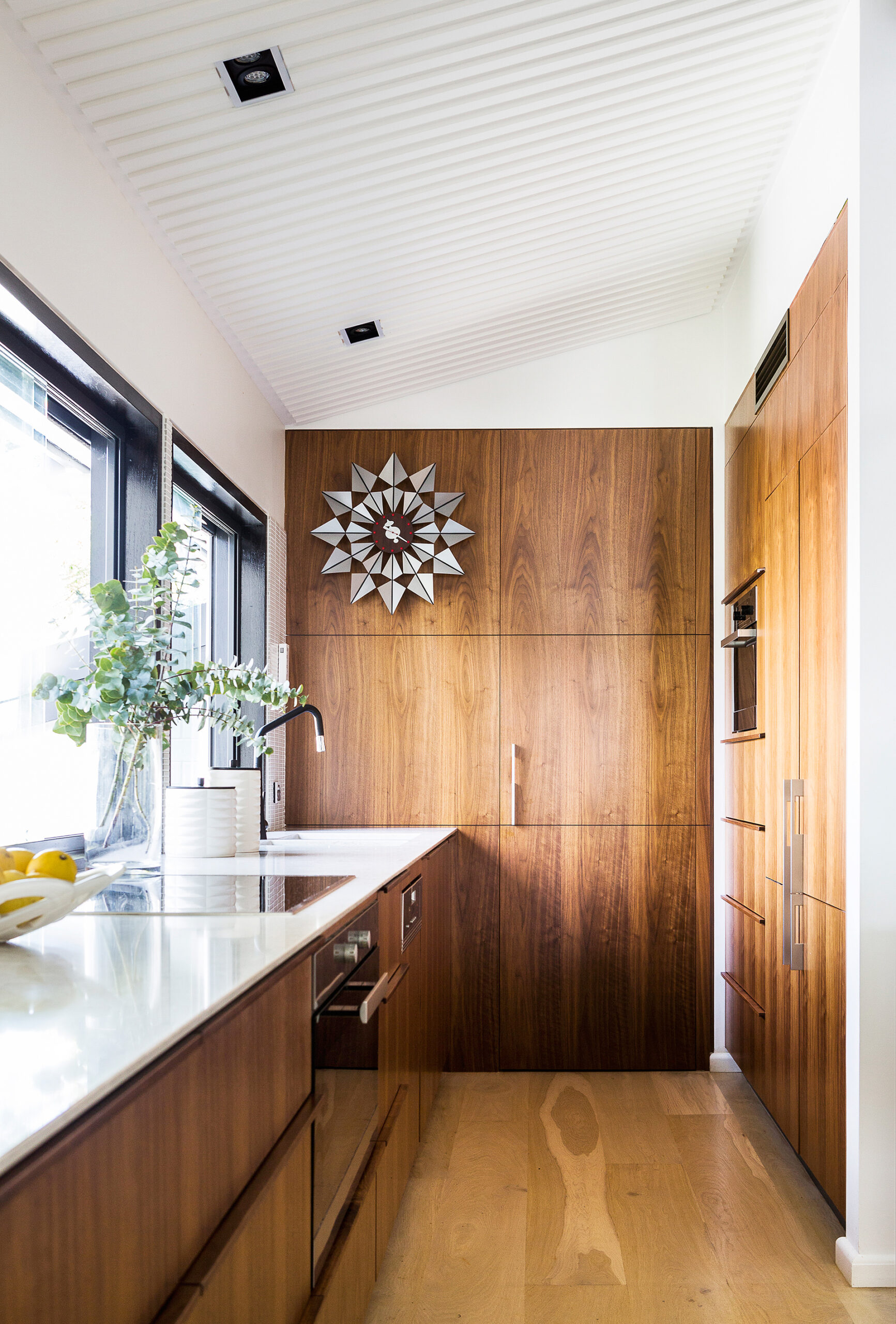 The kitchen within this revamped Modernist home retains a retro flavour with American walnut joinery and a vintage George Nelson Butterfly clock. Photograph: Maree Homer