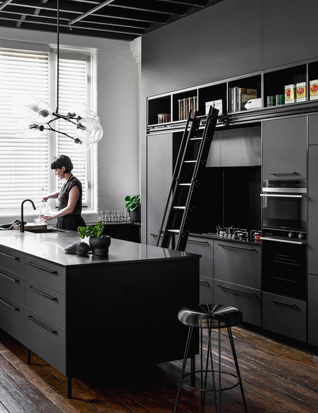 An island bench in a beautiful Bengal Black honed granite is at the centre of this bold kitchen in a warehouse conversion in Brisbane.