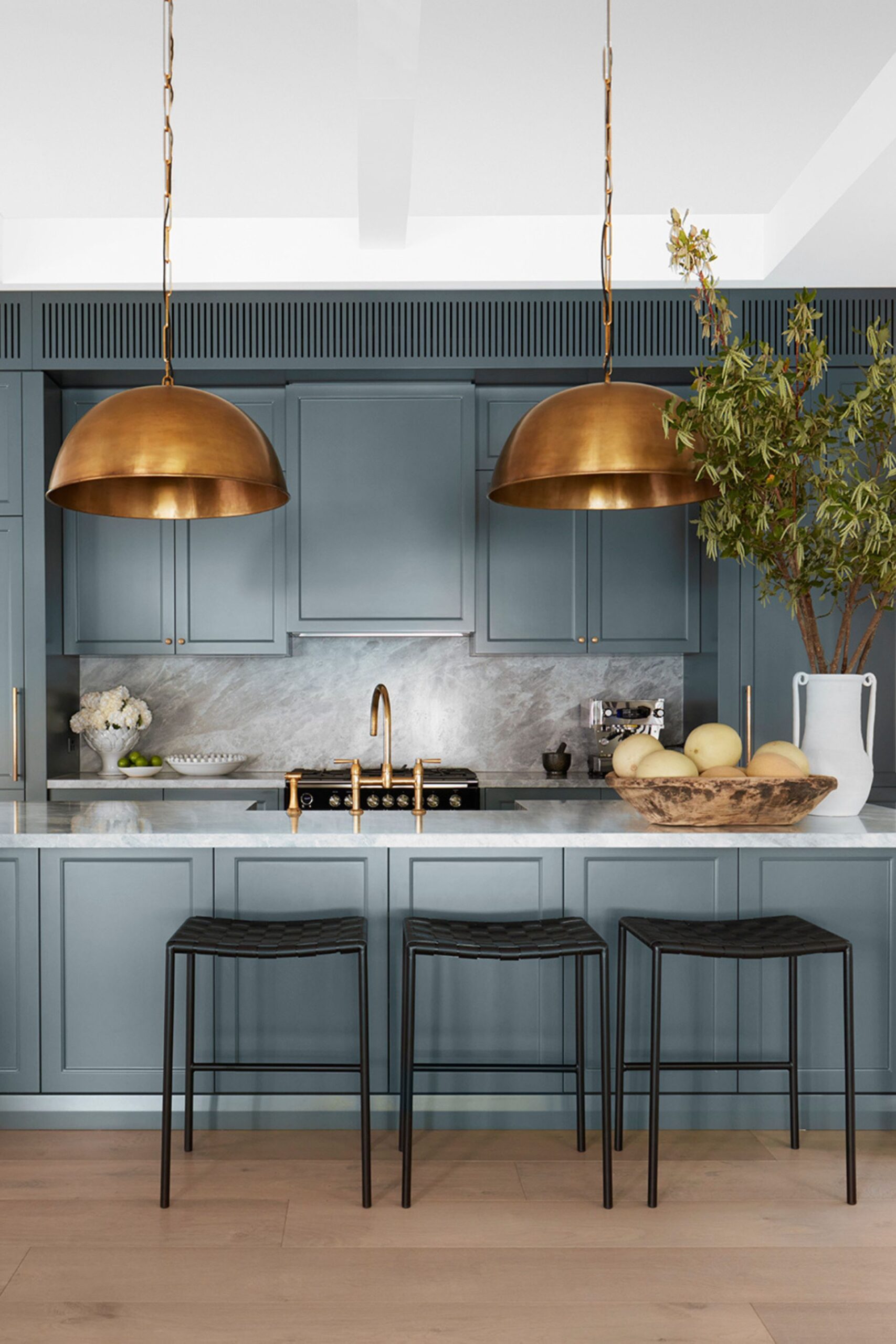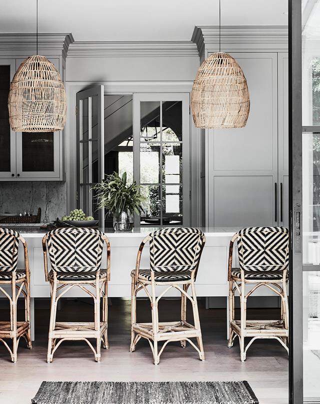 The kitchen is very much the heart of this home; to give it some gravitas, designer Morgan Ferry specified a muted blue-green for the joinery and Versilia marble for the benchtops and splashbacks. A butler’s pantry and laundry are cleverly concealed behind a pivot door.