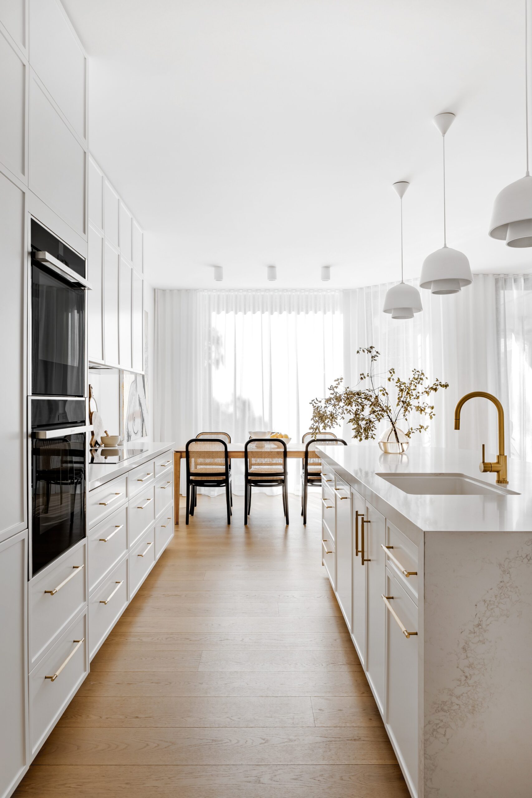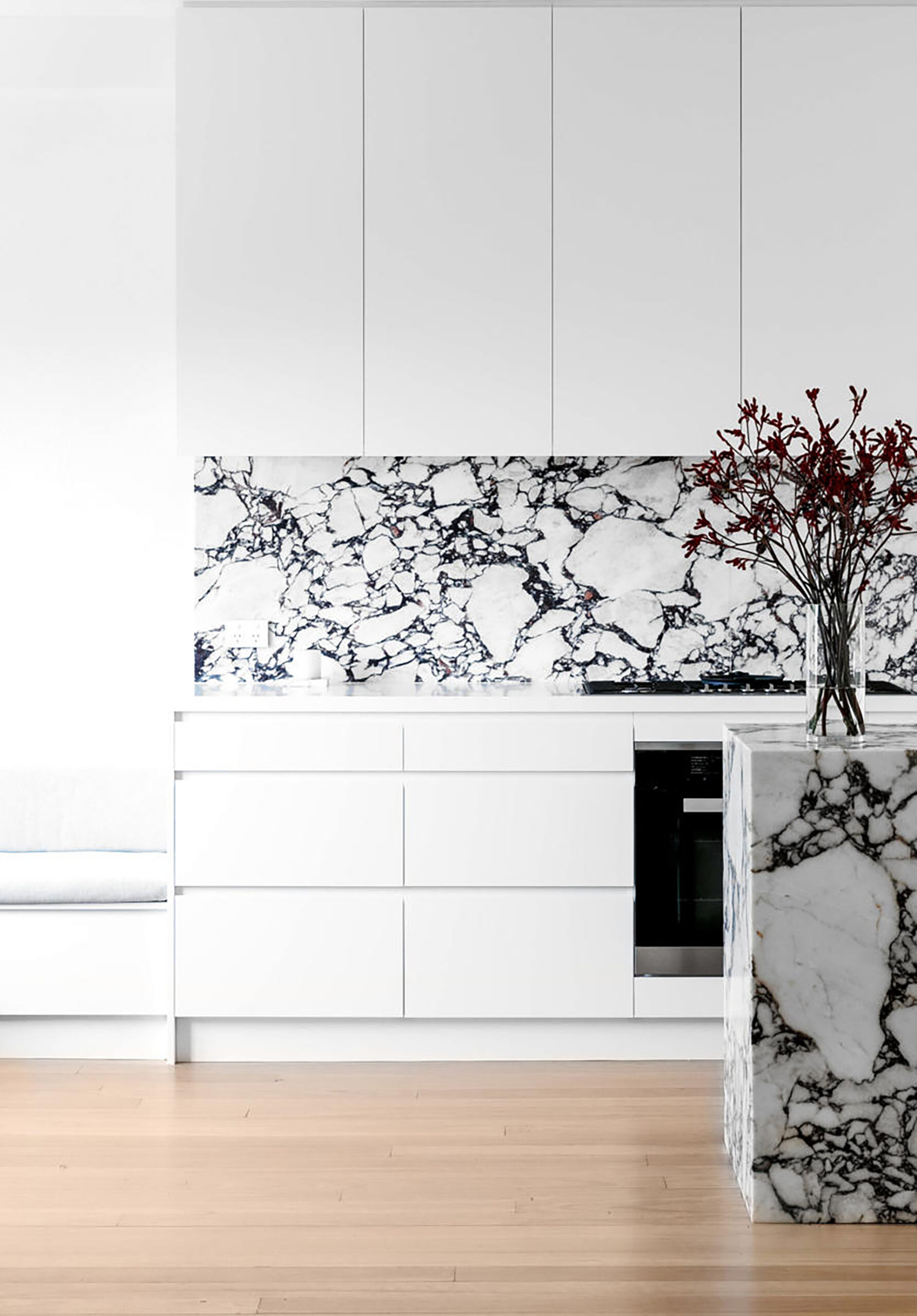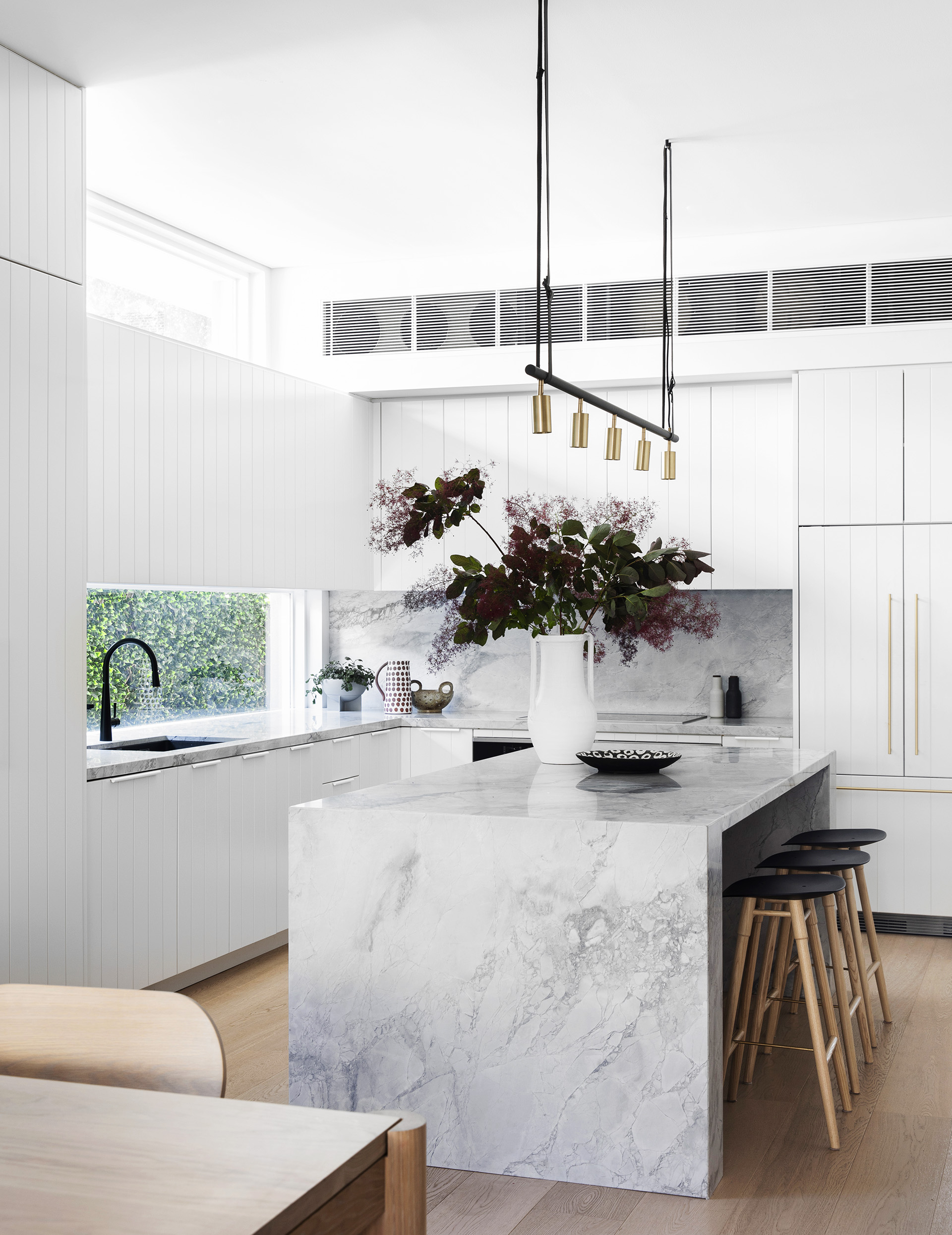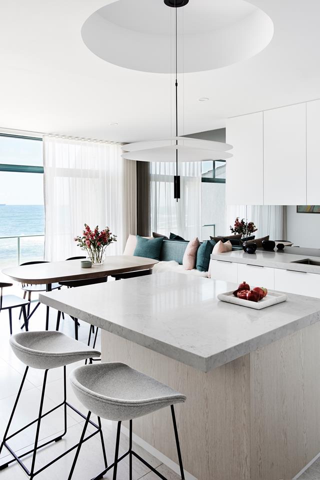 A luxurious ‘plinth’ of marble is the centrepiece of this timeless, simple and sophisticated kitchen. The owners “wanted a modern, fresh, inviting and timeless design,” says Chris Ruffe, director of Bondi Kitchens who revamped the space in collaboration with The Interior Collective.