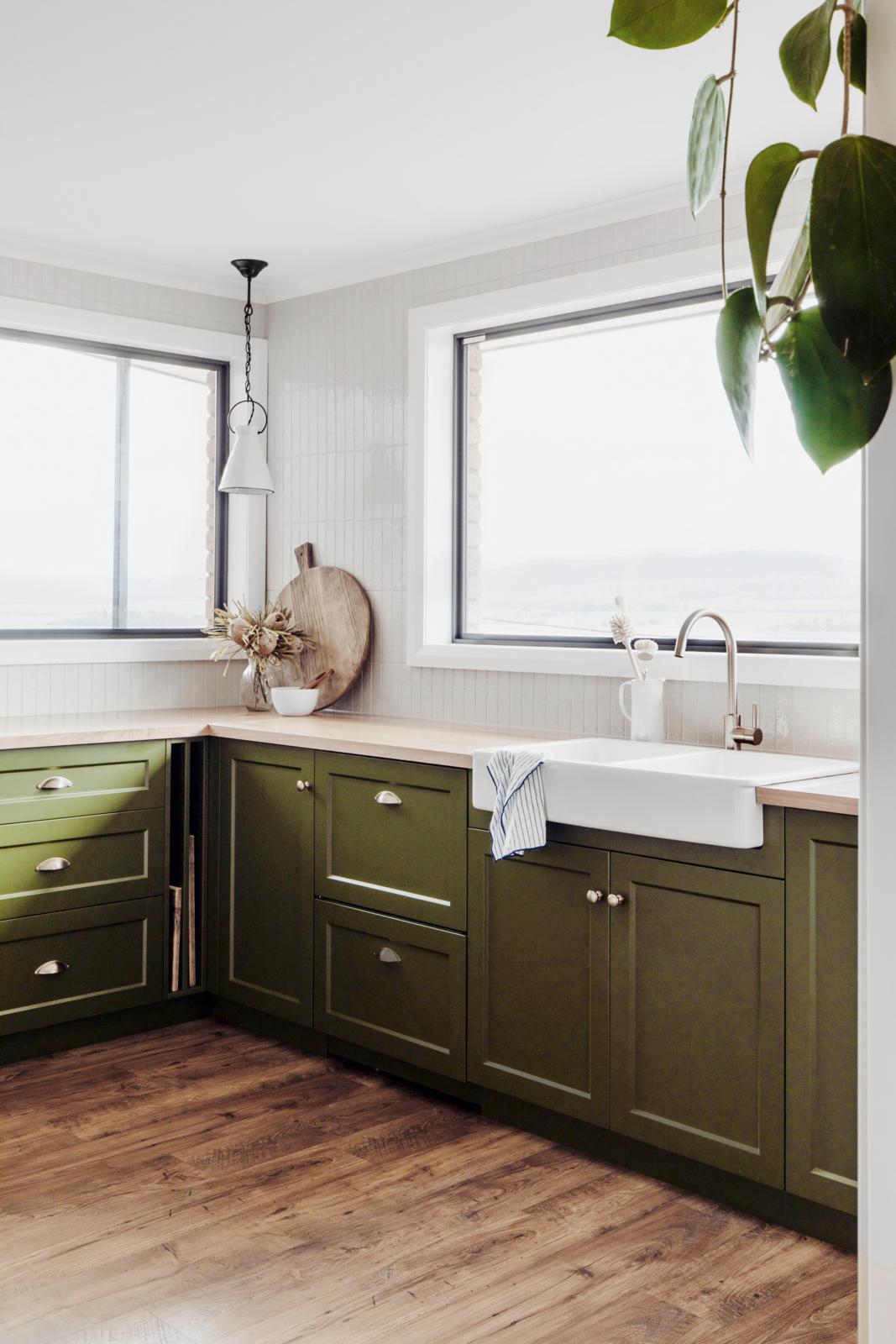 Tying this kitchen’s scheme together is the Shaker-style joinery, painted jungle green. “We explored various tones of green before settling on this one, Dulux Amazon Depths, which works beautifully with the timber benchtops,” says designer Lydia Maskiel.