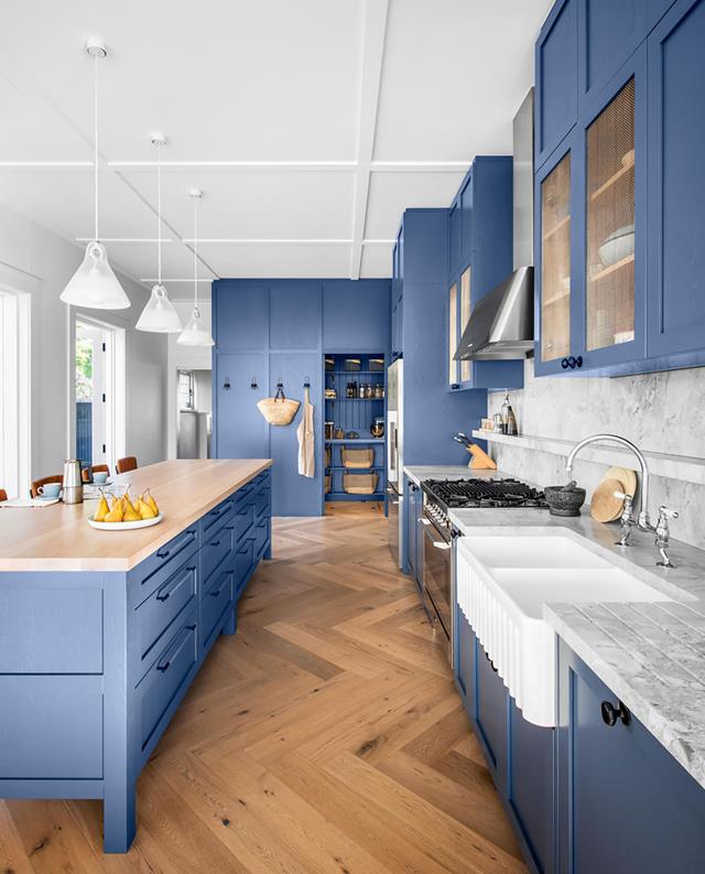 A deep tonal blue and a mix of natural, durable materials were the key ingredients in this country-style kitchen conceived by interior designer Georgie Shepherd.