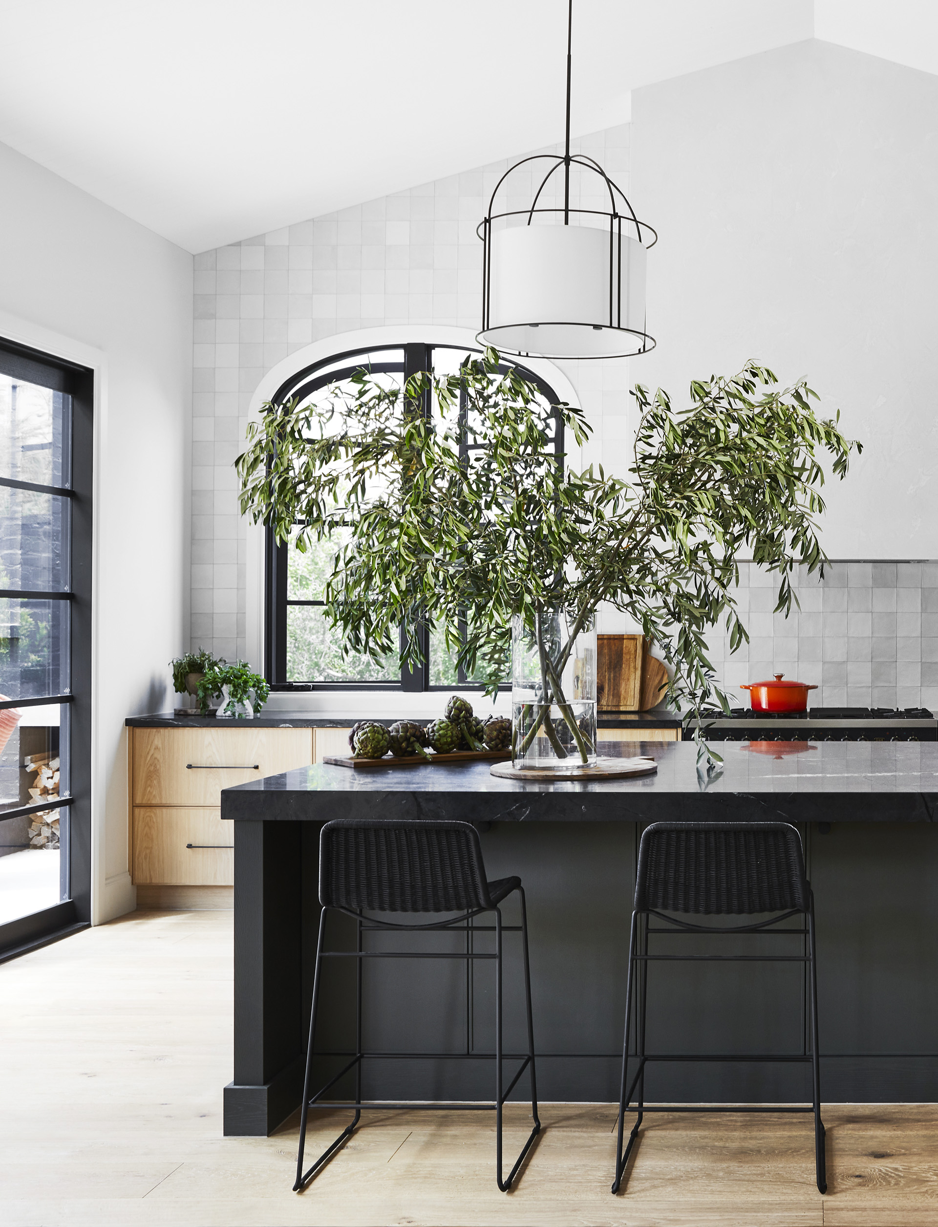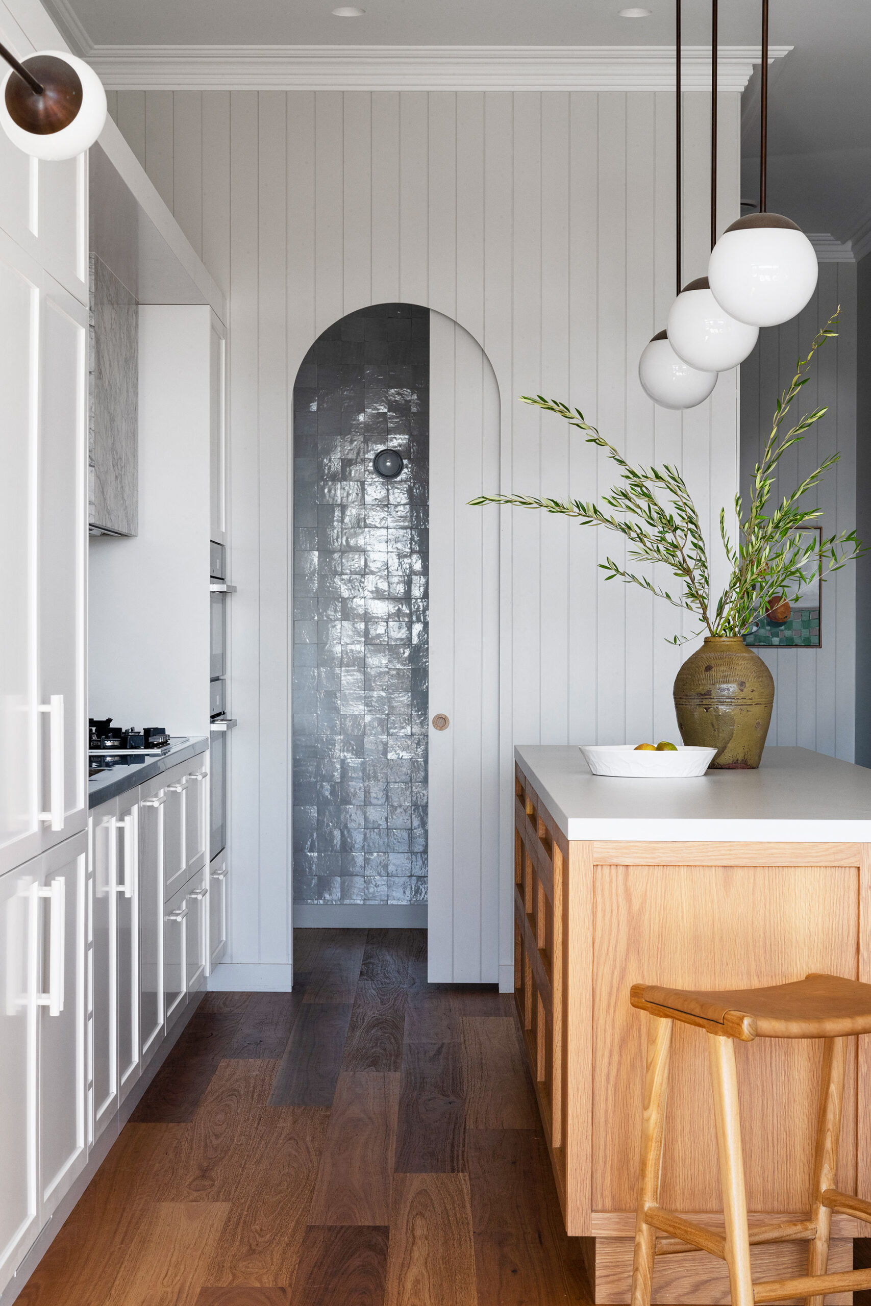 With white, marble and timber accents, the kitchen in this harbourside house brings heart to the home. A butler’s pantry is concealed behind an arched VJ-panel doorway and lined with Moroccan wall tiles in Snow from Surface Gallery.