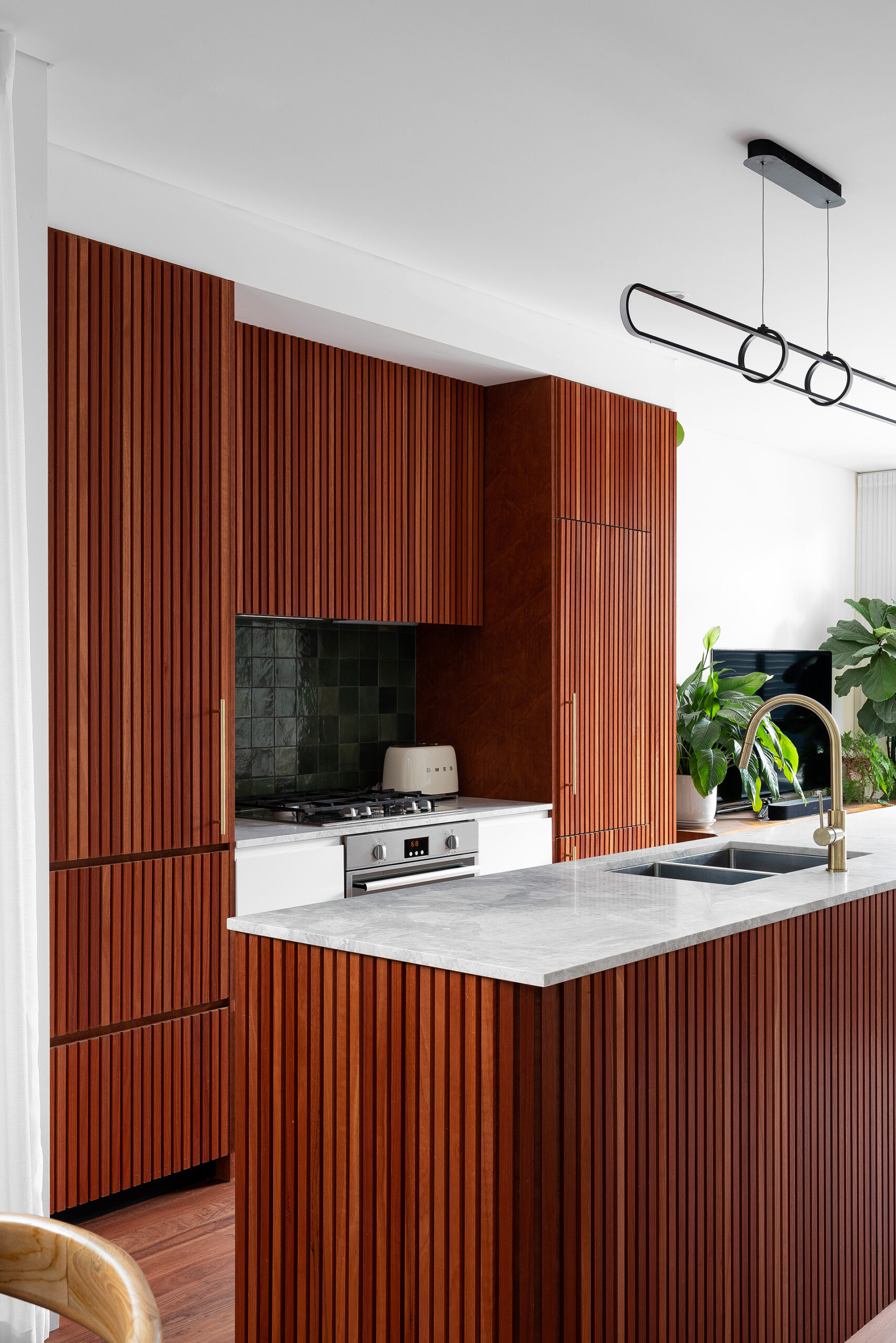 The highlight of this delightfully modern kitchen conceived by architect Adam Brewer and Braeside Joinery is the sinuous island bench that features custom-routed cladding.
