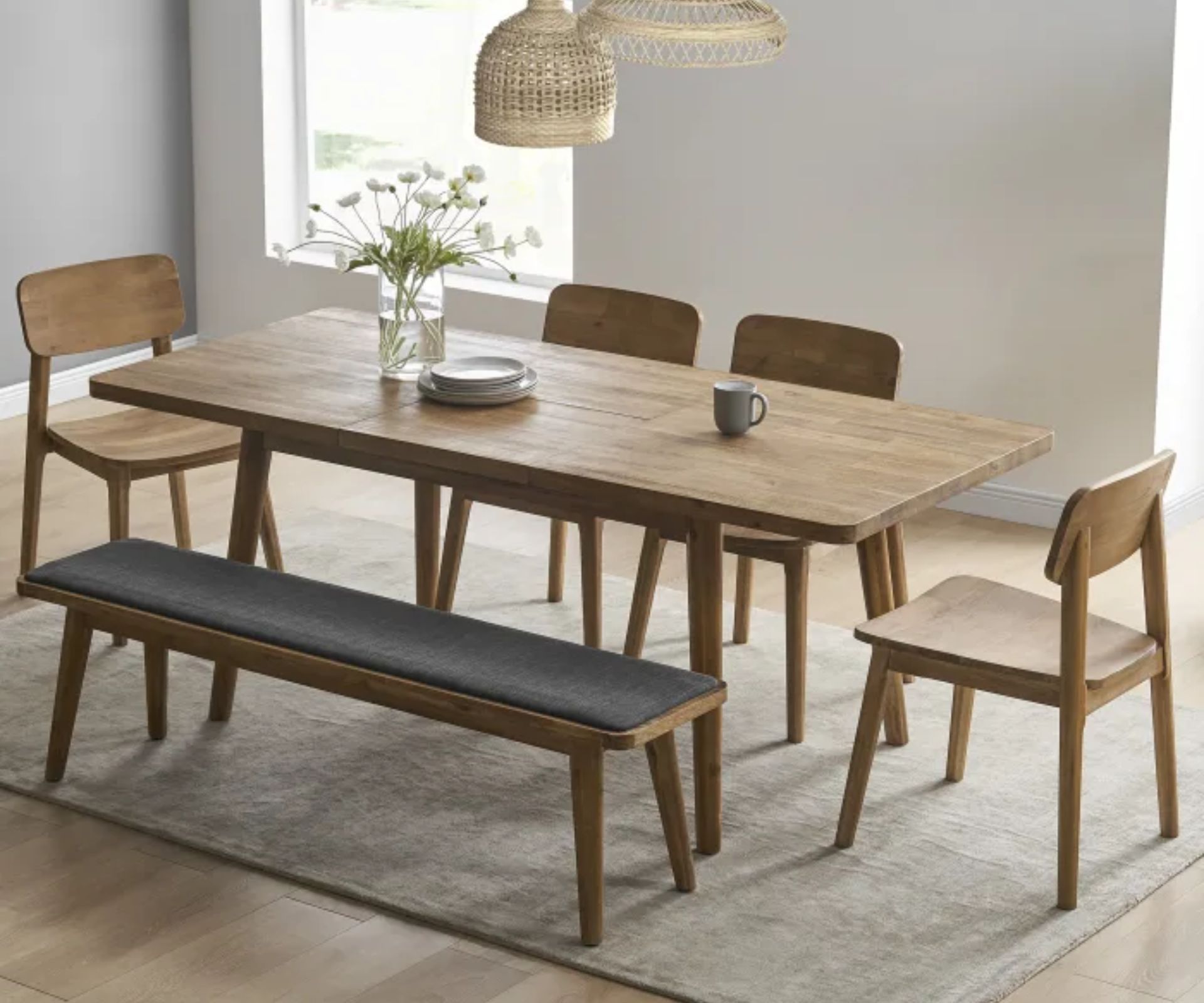 Perfect for coastal abodes, this dining set from Freedom features six classic wishbone-styled chairs paired with a softly rounded natural oak dining table. Perfect for larger families or those who love to host.