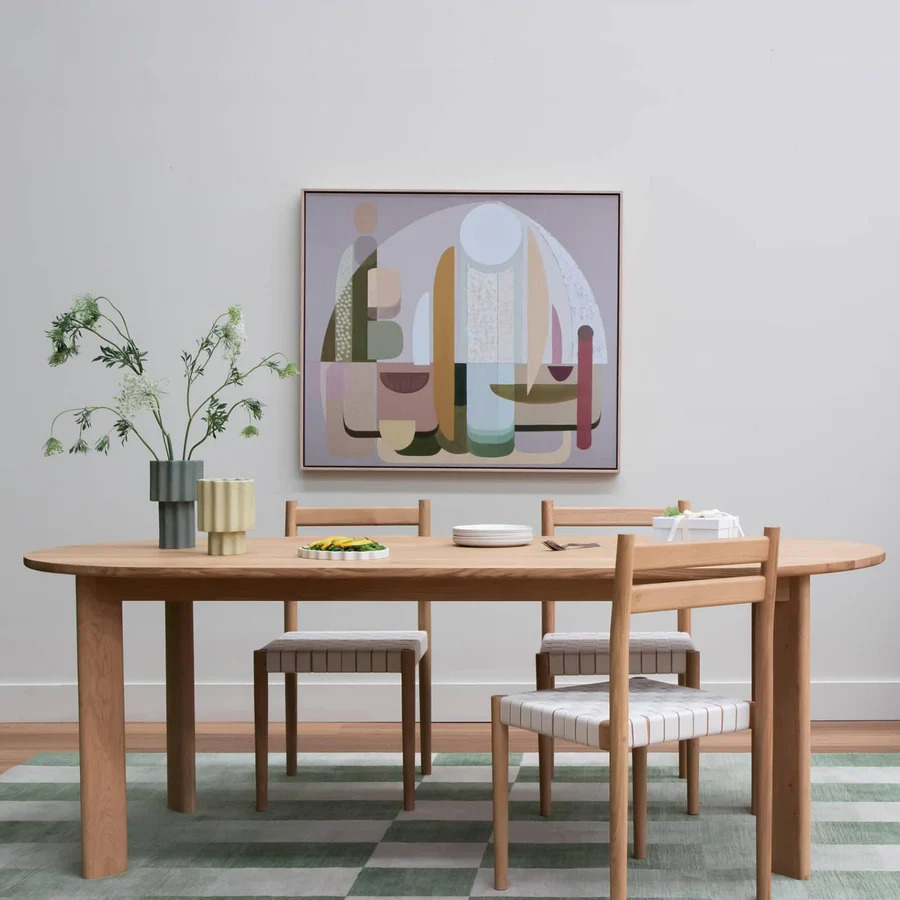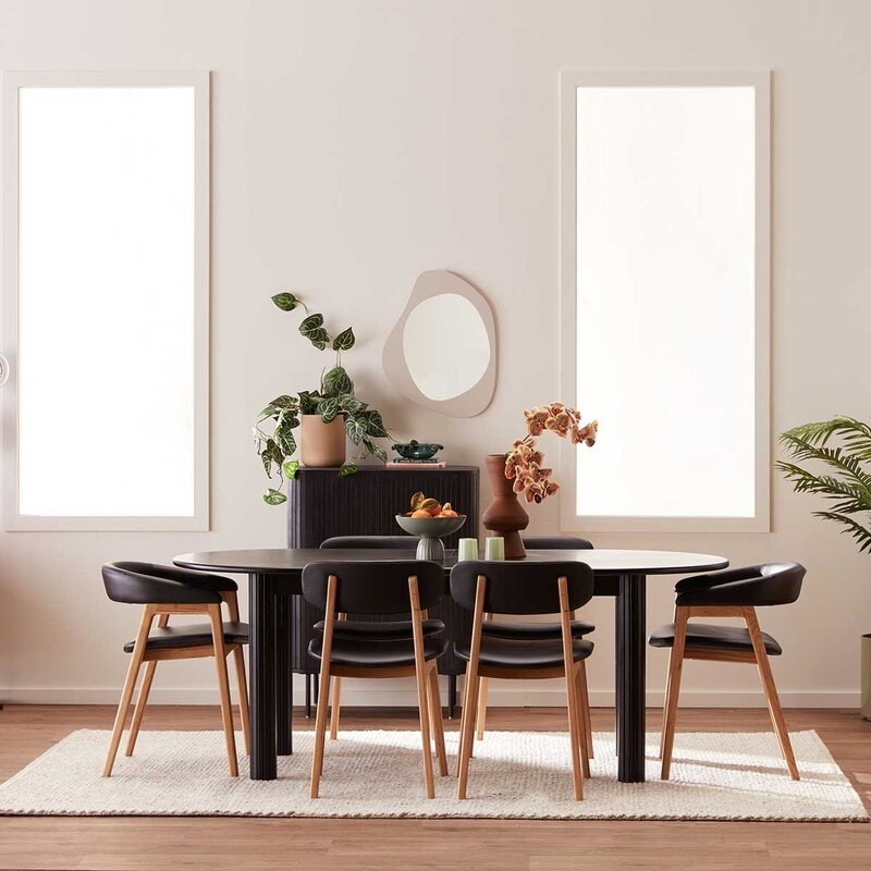 Consider an oval dining table the perfect medium between a generous rectangle dining table and a compact round dining table. Its soft rounded edges help reduce the amount of ‘dead space’ generally found with traditional rectangular dining tables (and is a tick according to the principles of feng shui), giving you more space to move freely within your dining space. An oval-shaped dining table also allows for more guests at the table when compared to a traditional round dining table and enhances conversational flow as each person is able to see one another.