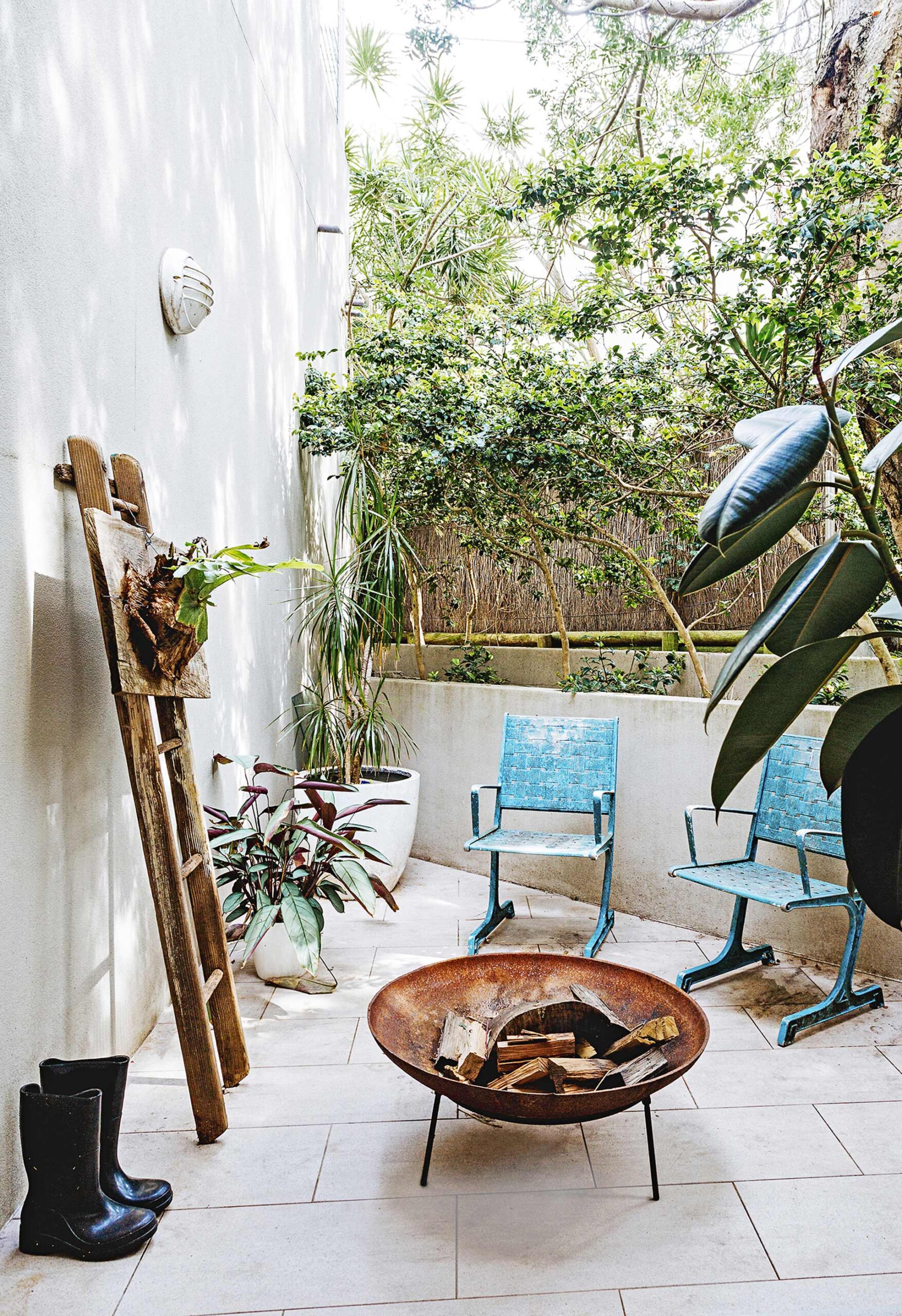 In the creative home of artists Vicki Lee and Ted O’Donnell a cast iron firepit has transformed their balcony into an entertaining zone that remains cosy all year round.