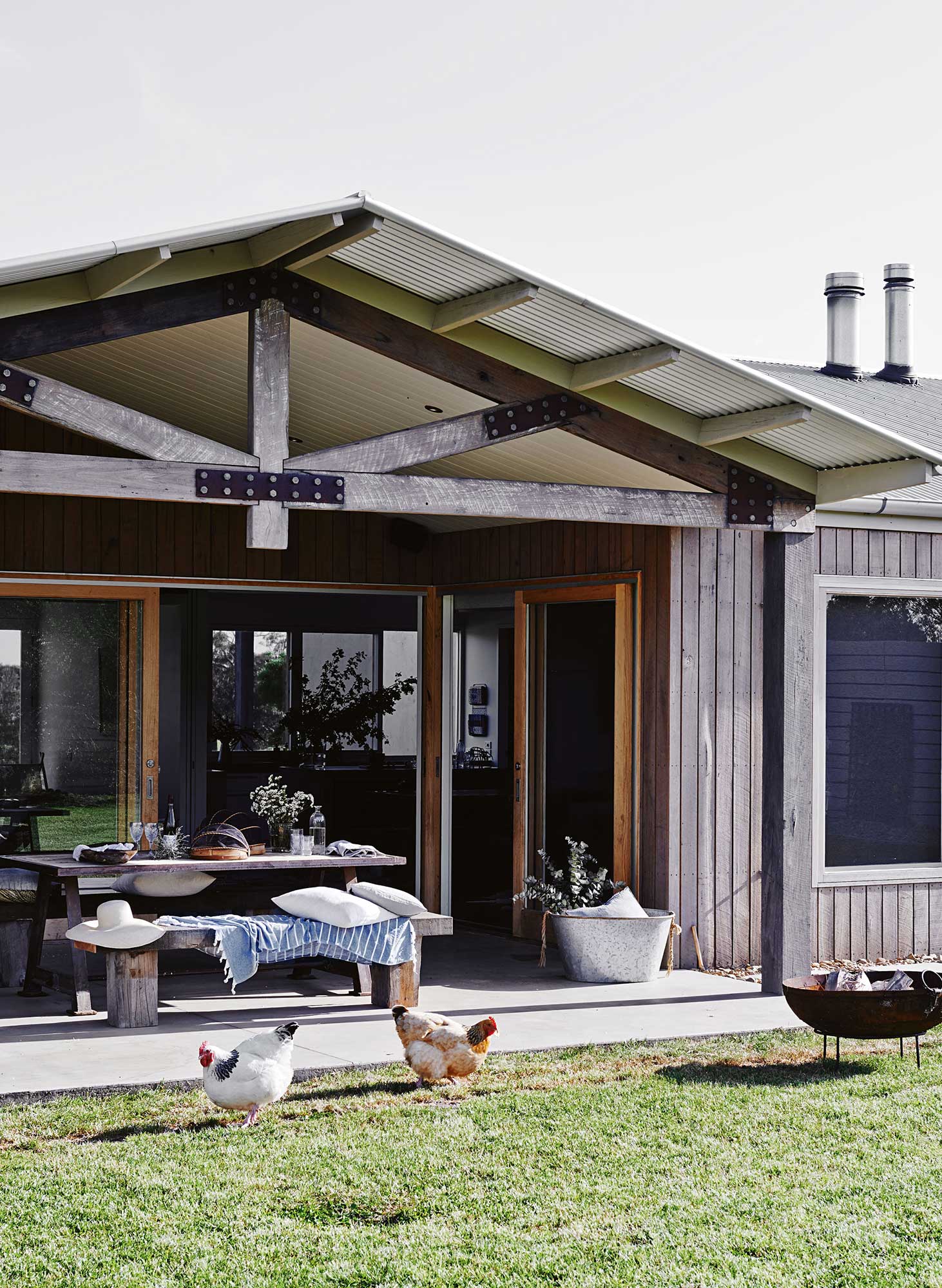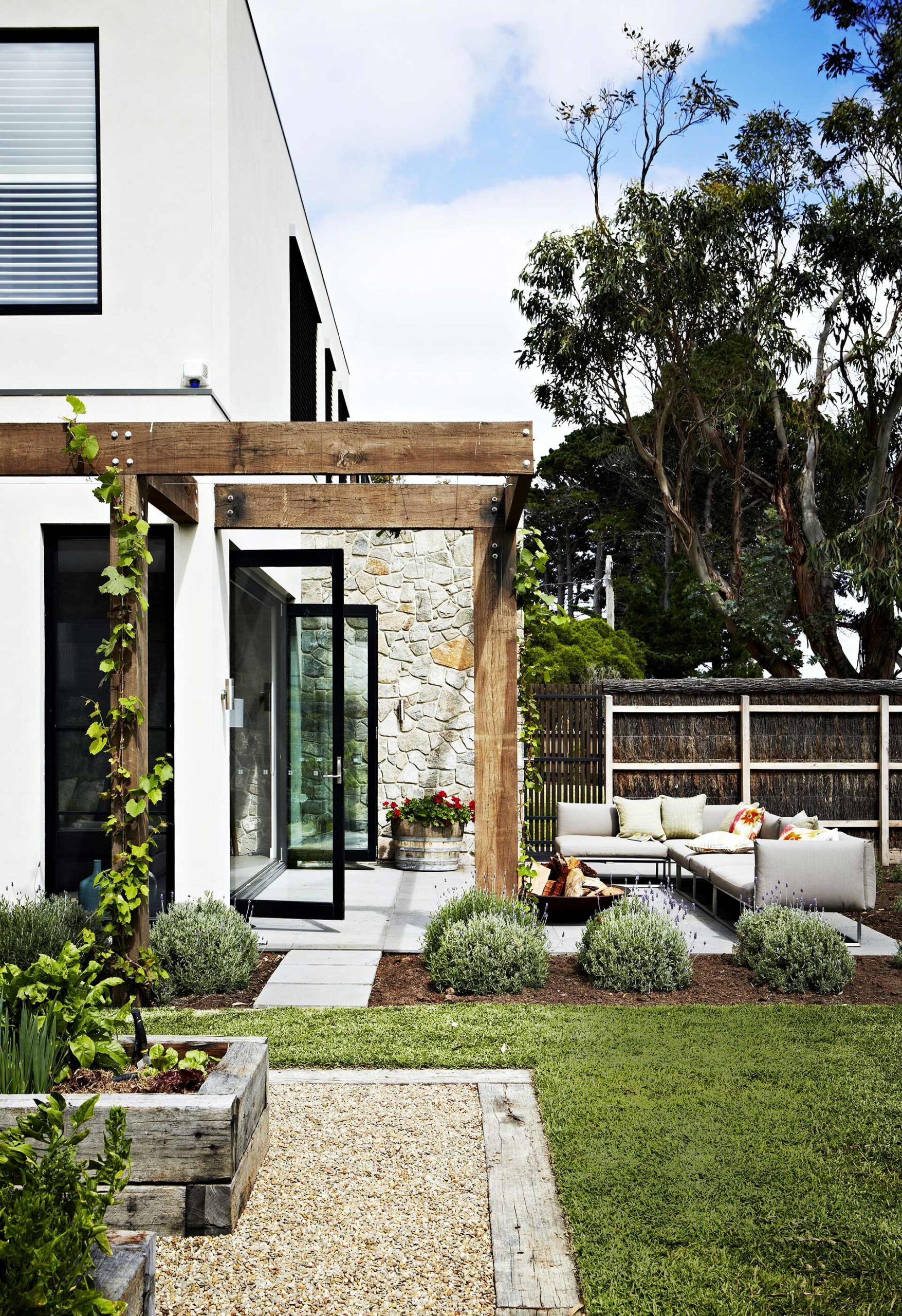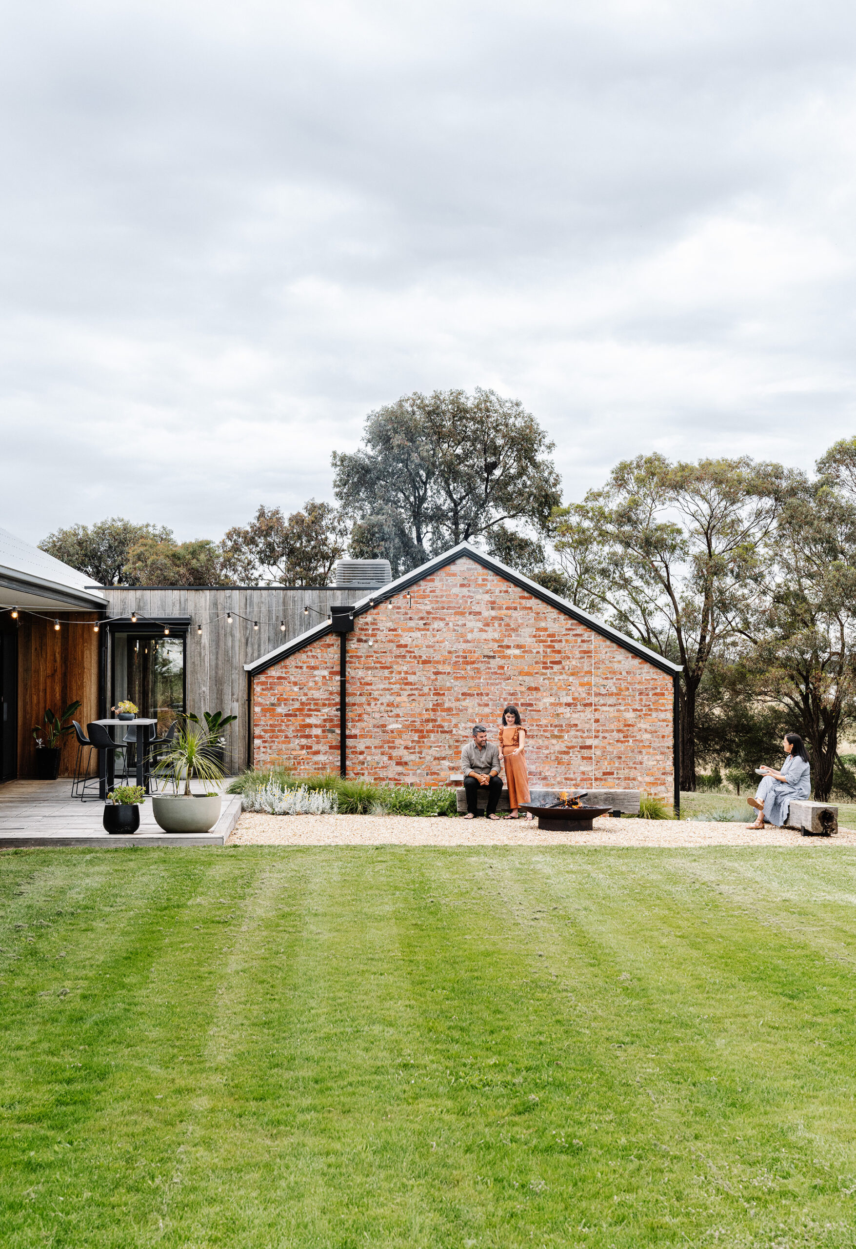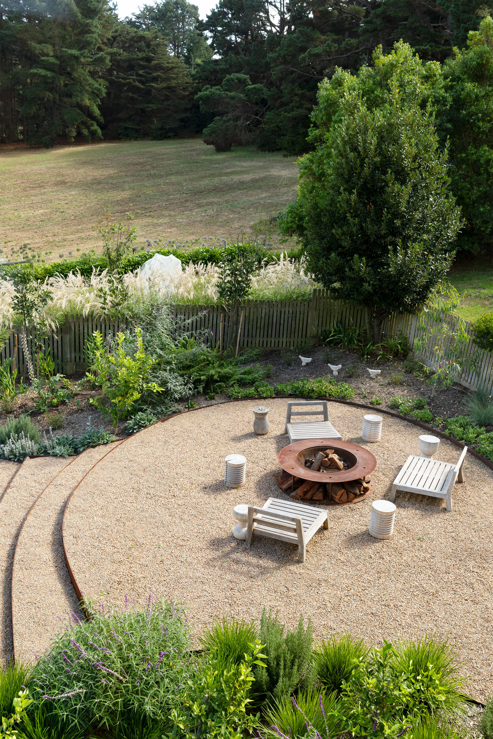 In the yard of this modern farmhouse-style home on the Mornington Peninsula, a perfectly landscaped fire pit zone invites gatherings. Shaded by a bay tree and further enclosed by the surrounding pines and bushland, the area feels intimate and private.