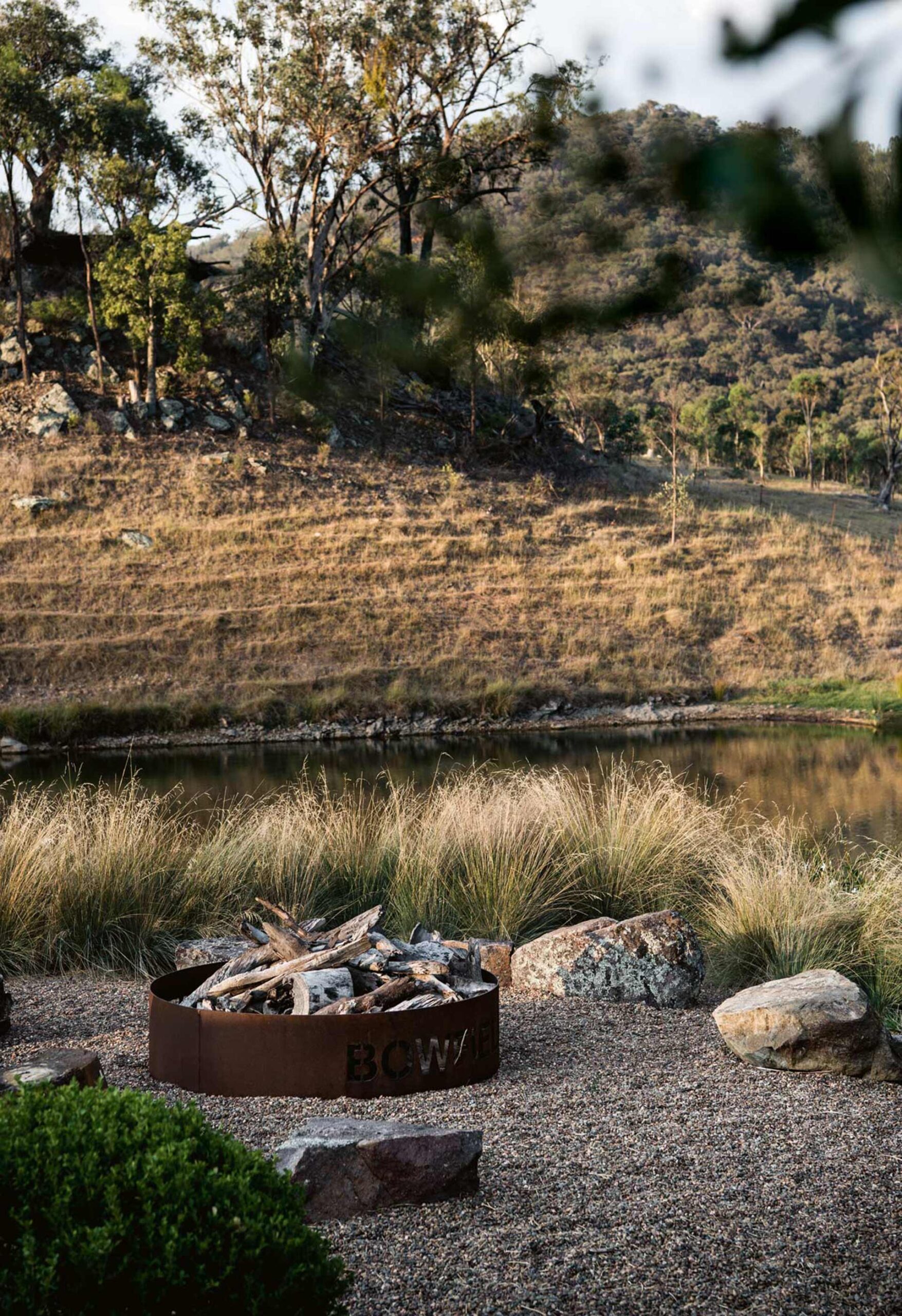A trio of country cottages were joined together to create the incredible Bowfield abode. Making its home on the generous acreage, this fire pit has “Bowfield” laser cut into its side, adding a truly personalised touch to the entertaining zone.