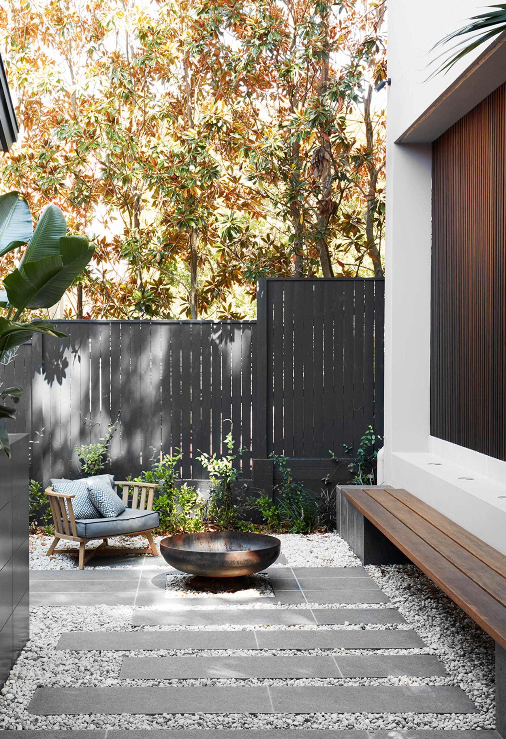 In the courtyard of this modern family home inspired by Japanese design, grey pavers are paired with grey gravel to create a relaxed zen-style outdoor entertaining area. A beautiful curved fire pit is nestled in the heart of the courtyard and a timber bench provides ample seating.
