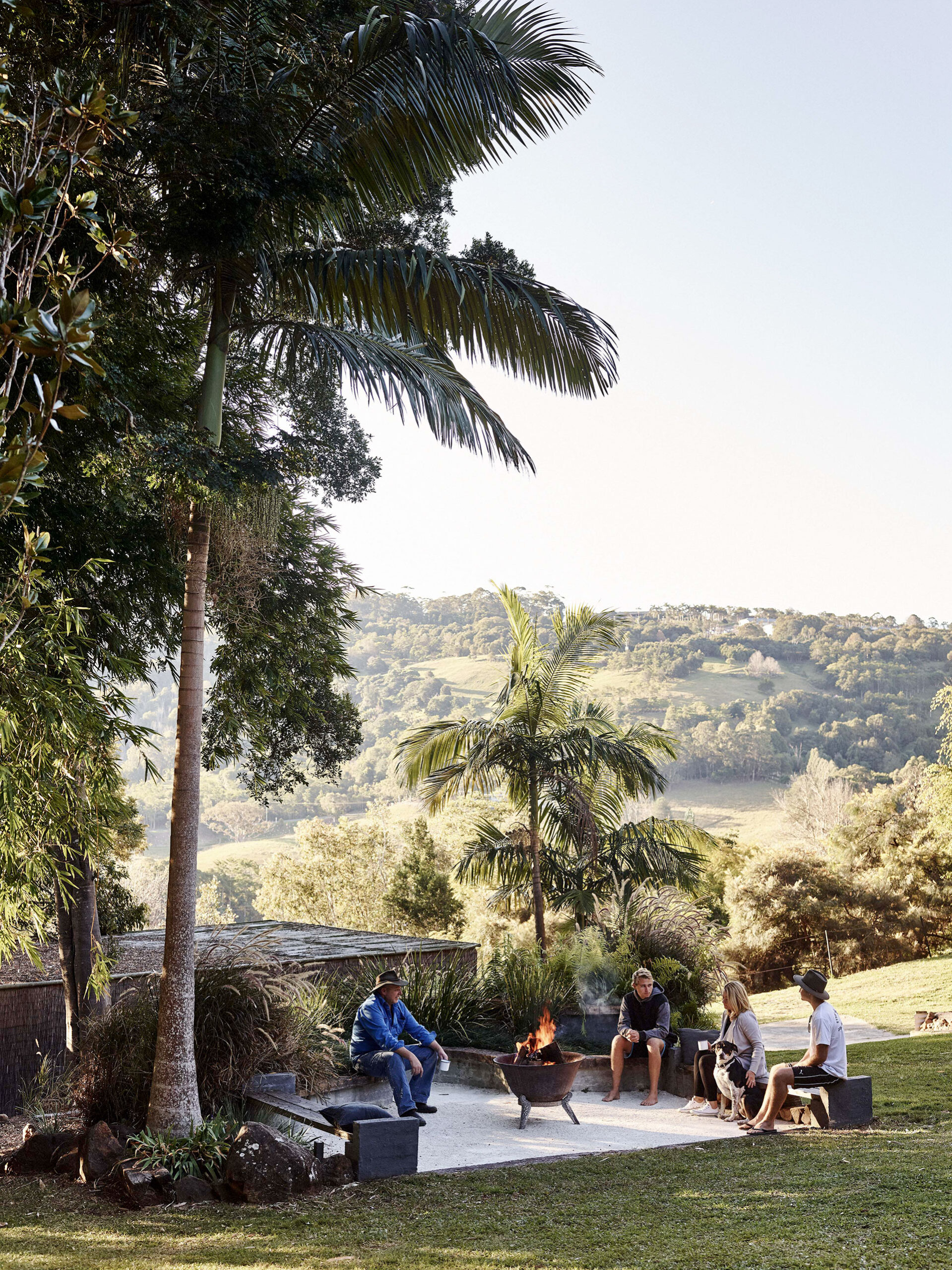 This renovated river cottage was designed to make the most of its stunning natural surrounds. Nestled under soaring palm trees, this outdoor entertaining area features rustic timber benches surrounding a fire pit that’s perfect for relaxing around throughout the year.