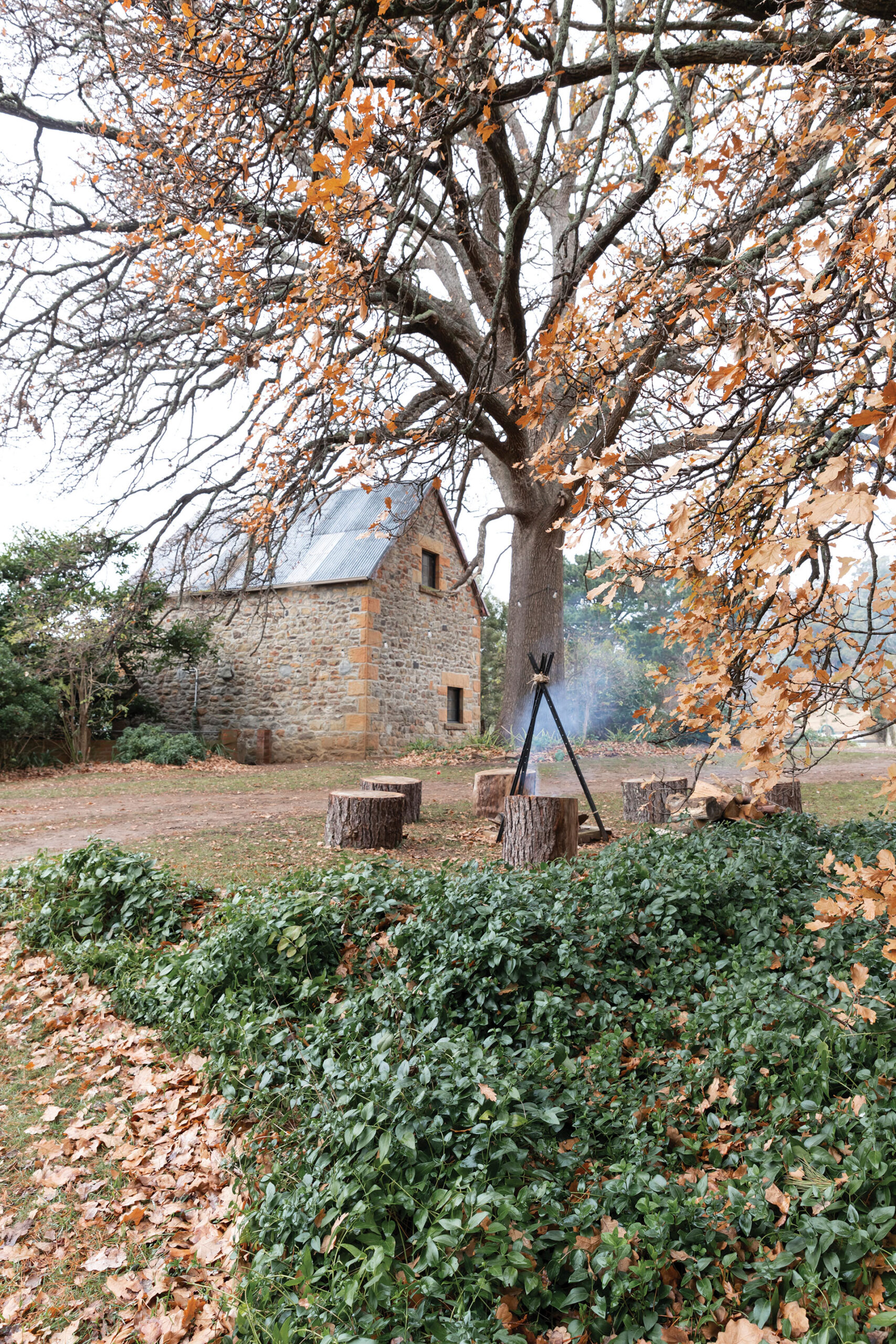 Sitting nestled into a valley outside the village of Buckland, Tasmania, the historic Twamley homestead has been handed down through a total of six generations. Out in the garden, simple log seats surround the communal fire pit, which provides sweeping views across the valley.