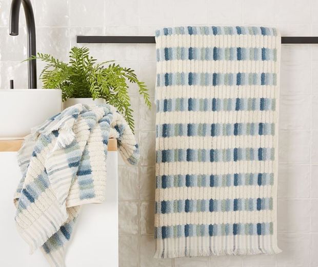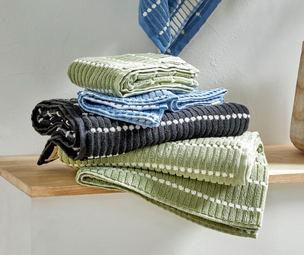 Prefer something bright or patterned? These towels from Pillow Talk feature a fun and timeless textured stripe design in muted yet colourful tones. It’s soft, durable and fast drying.