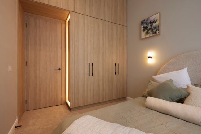 Keeping in with the neutral tones, Brad and Mel’s renovation of the main bedroom saw them incorporate plenty of storage and recessed lighting.