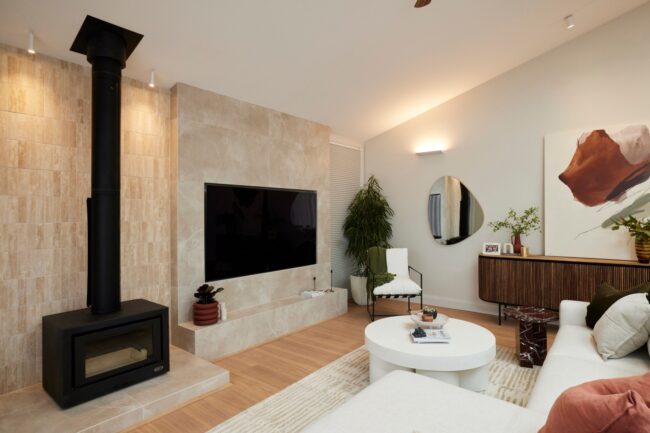 Keeping with the warm, neutral colour palette, the living area -which was executed by Lara and Peter- enjoys plenty of natural light streaming in through the home’s pitched skylight and large sliding doors. Curved decor and soft furnishings add to the warmth of the space alongside a wood heater.