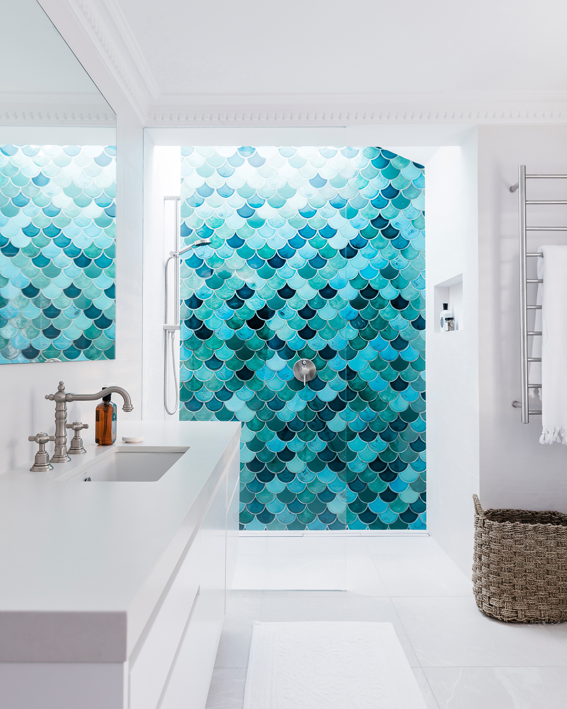 “These tiles are all individual – they don’t come on a mat or anything. We created a random pattern and got our tiler to replicate it,” Lana says. (Photography: Maree Homer)