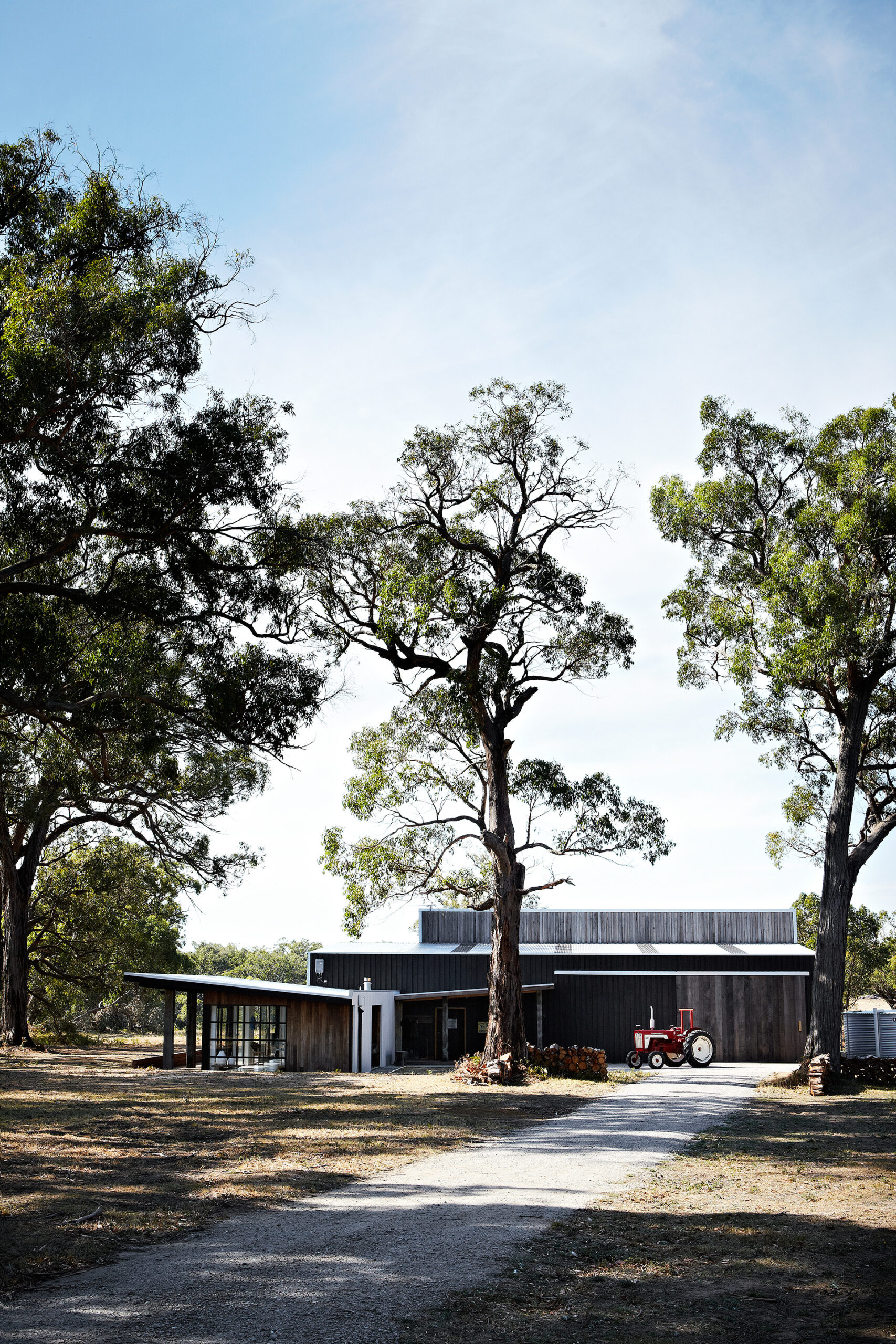 By connecting and converting two barns on their property, Nguuruu Farm, the Prior family created a spacious four-bedroom home. “It’s essentially two pavilions connected by a glass air bridge,” says owner, Murray Prior. “We live in one and go to bed in the other.” The barn-style home boasts six-metre ceilings, rammed-earth walls, and a solar-passive design.