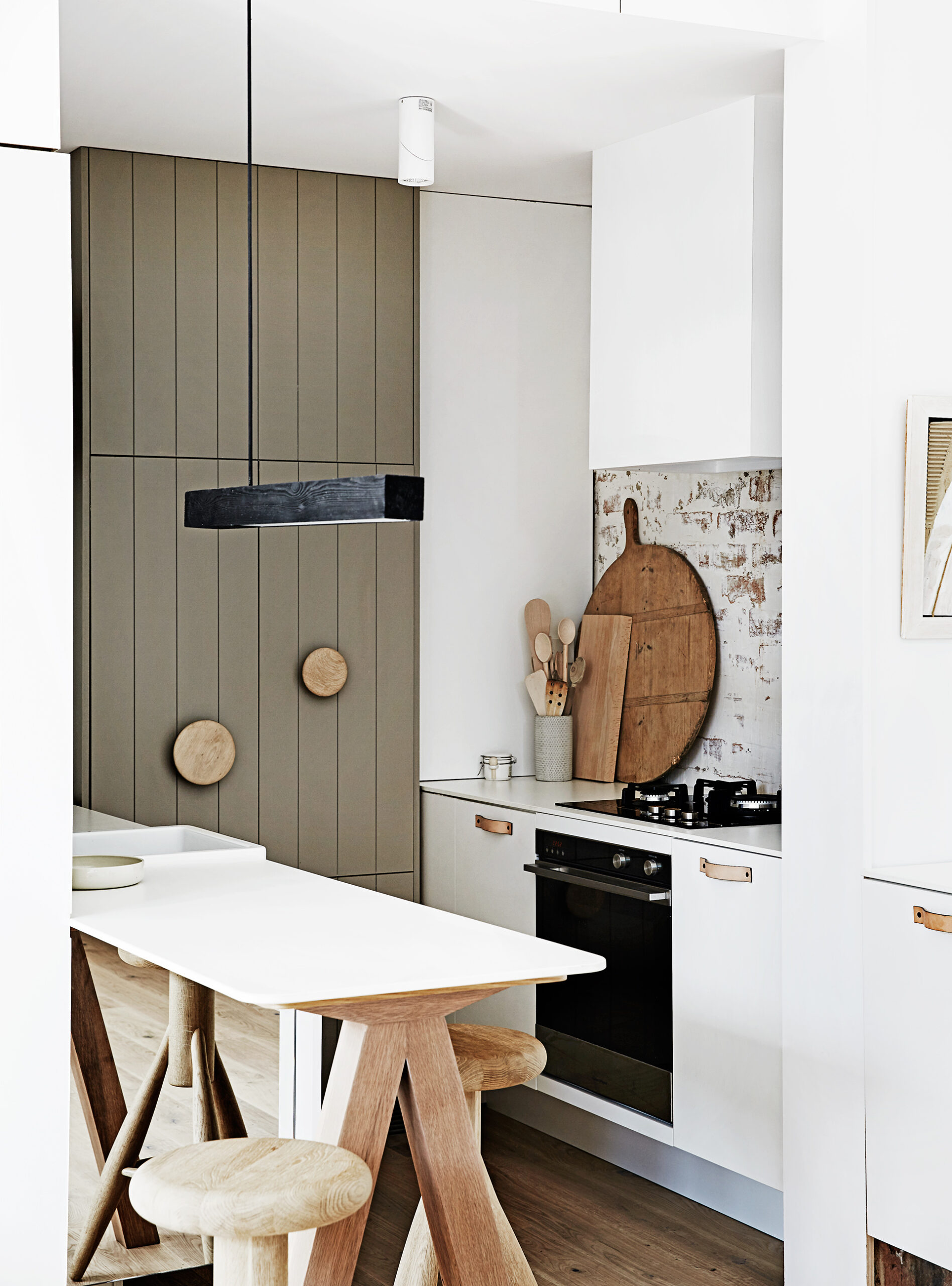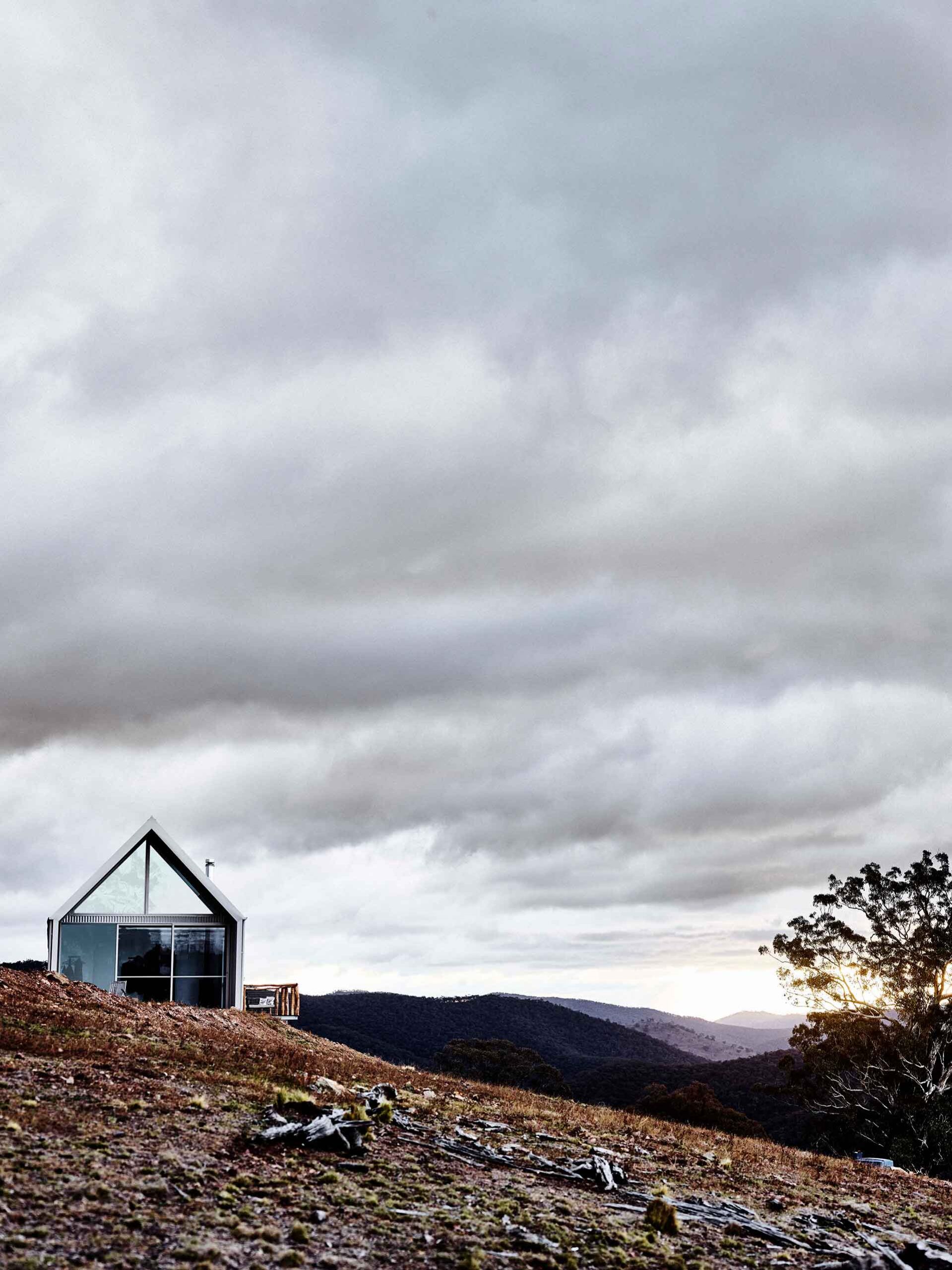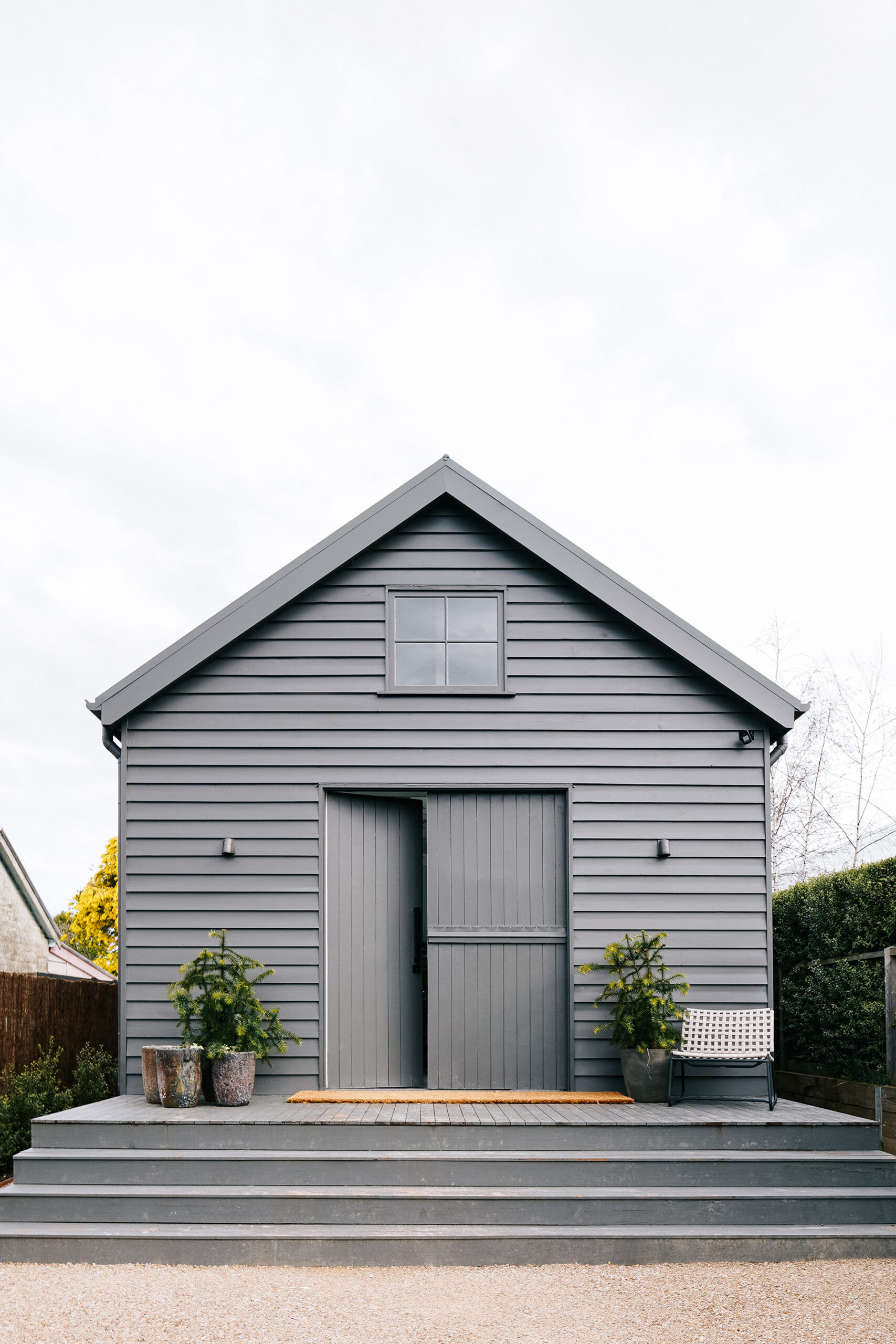 This small barn-style house in Daylesford follows classic barn design, with a high-pitched ceiling, exposed beams and split “Mr Ed-style” doors. Four large windows from an old schoolhouse add authenticity to the new build and flood the space with light.