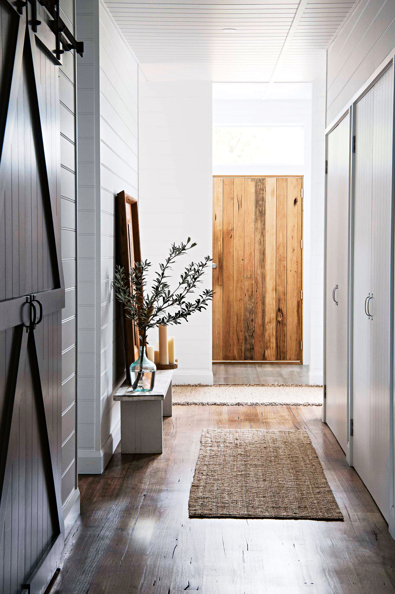 Custom-made barn doors, timber wall panelling and rustic country decor, give this beach house a barn-like feel. The home’s exterior is also clad in timber panelling and painted in Dulux Domino.